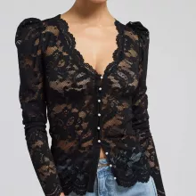 Unlike ordinary blouses, this one features a blend of bold and feminine with its transparent lace and elegant tailoring. The solid floral mesh detail is striking yet wearable, making it a standout piece in any wardrobe. With its mix of stretch and structure, it flatters a variety of body types while offering enough comfort to wear all day or night.