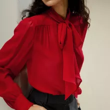 Unveiling a modern twist on a timeless classic, our blouse features a delicate bow-tie neck design, exuding charm and grace in every detail. With its regular fit, it effortlessly accentuates your silhouette, offering both comfort and style.