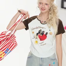 The soft knitted fabric made from a breathable cotton-spandex blend feels light and smooth against the skin. Featuring a regular fit with a classic O-neckline and sweet fold details, it balances simplicity with statement-making flair. The eye-catching cartoon print brings out your fun side, while the non-stretch knit structure ensures a relaxed, breathable feel throughout the day.