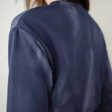 Made from a mix of 57.9% cotton, 39.2% polyester, and 2.9% spandex, this sweatshirt offers just the right amount of stretch while maintaining a structured look. The fabric is lightweight yet warm, making it ideal for cooler seasons. Whether paired with jeans, leggings, or joggers, this sweatshirt is as versatile as it is stylish.